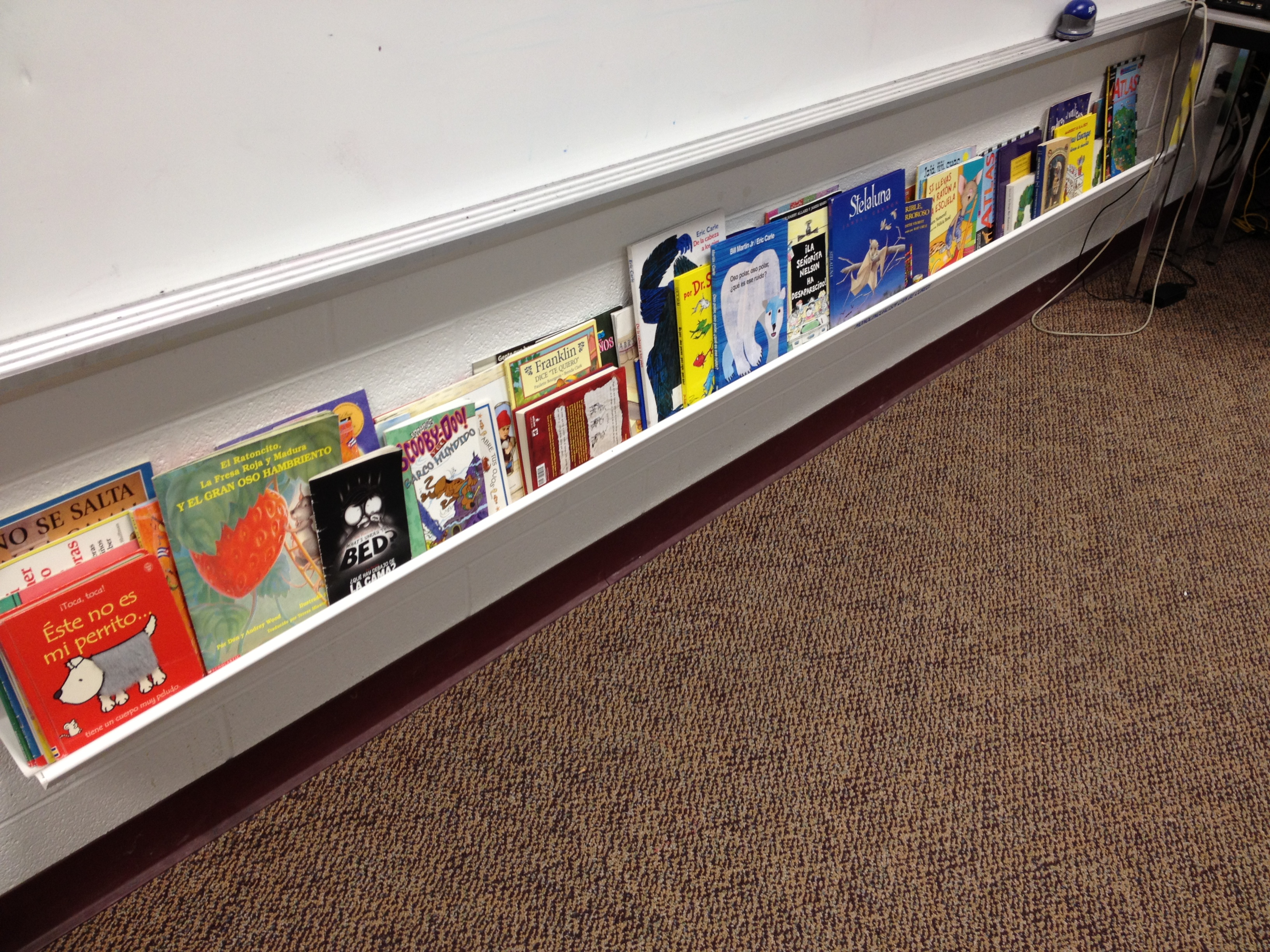 Raingutter bookshelves are cheap, durable, and easy to install (get your principal’s permission first!). I was able to use that wasted wall space under my whiteboard by having a gutter installed there. The books also really add color and style to my classroom!